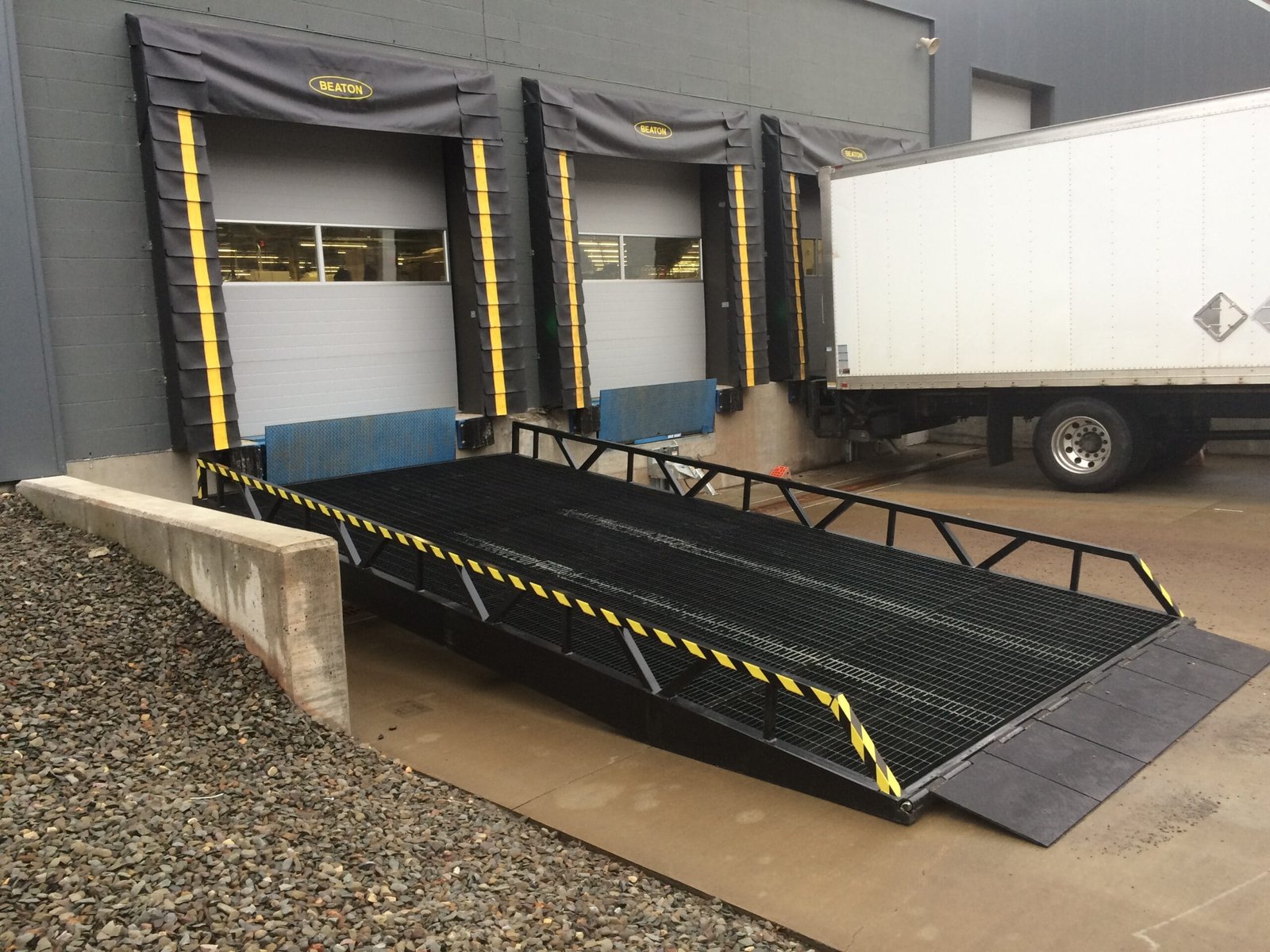 Amphenol Aerospace came to Nation Ramps with the issue of having to fully open their bay door for frequent small package deliveries. While not always a problem, during the winter months in New York the drop in temperature could make having the door open for even a short time thermally inefficient, not to mention quite unpleasant. They decided a cut out door in the main dock roll up, coupled with a 20ft Nation Ramps Ground to Dock Ramp, built to custom height, was the perfect solution. Now, instead of ground level deliveries, all package trucks use the T-Lane ramp to back directly up to the new delivery access in the heart of their shipping receiving center. The new access greatly reduces weather exposure, while the new custom docking level means packages are passed through at an ideal height for their conveyer system, reducing back strain and potential for injury.